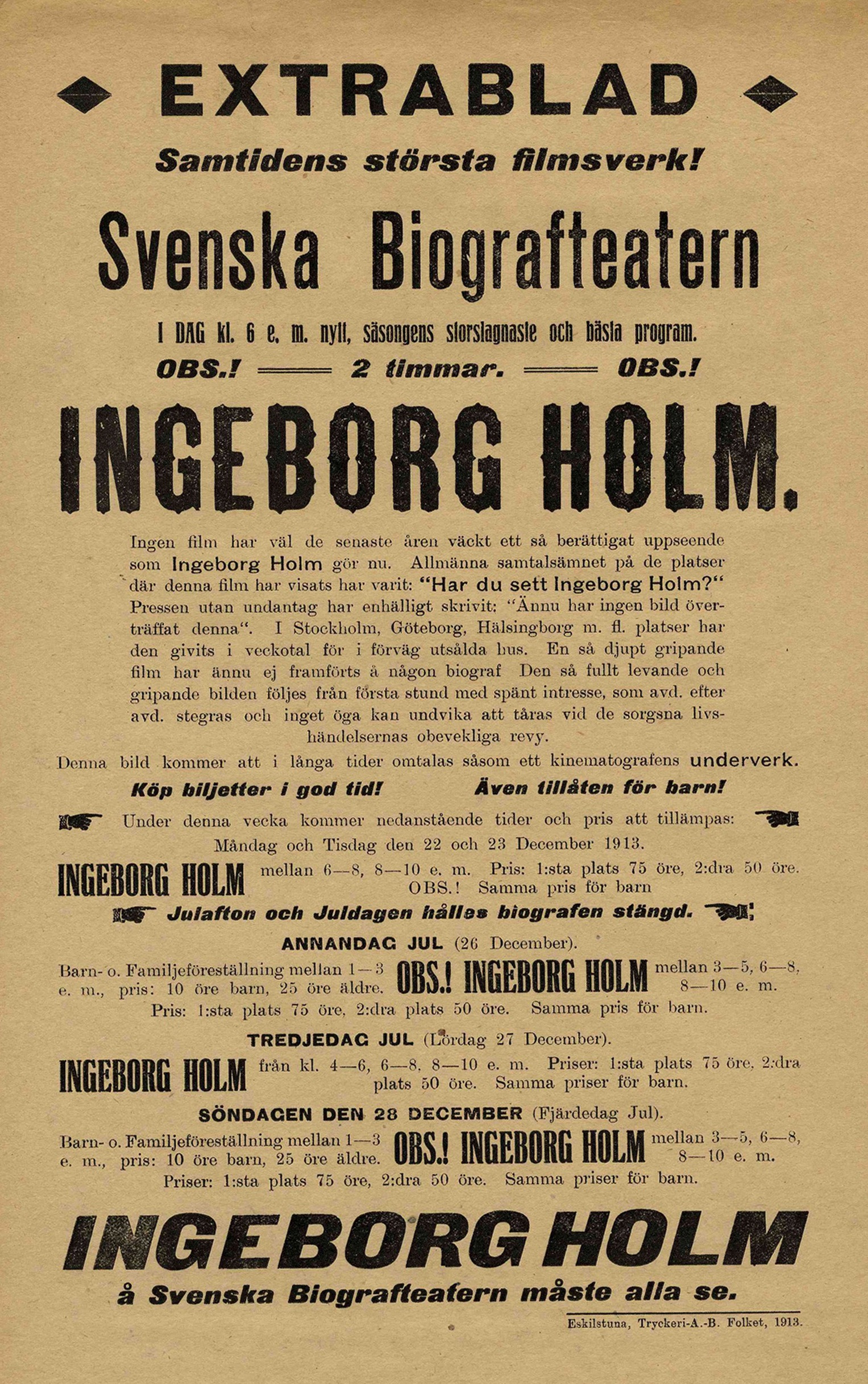 瑞典电影先锋维多舍斯特伦第八部作品,原着爲尼斯克奥的舞台剧。编导藉本片表现他们对现实社会的关切之情,笔触尖锐有力。在二十世纪初期,瑞典有一条“贫民法桉",其中有一个法律漏洞可以让投机者从贫穷的寡妇身边买走她的子女。本片的拍摄主旨是批出这个可怕的惨剧,让观衆对这个有失公正的制度有所反省。影片开始时,英厄堡·霍尔姆是一个快乐的太太,她丈夫是个成功的小店东,他们有三个年幼子女,家庭生活幸福。不料霍尔姆先生突然因心髒病发去世,霍尔姆太太面对债务无法偿还,遂被政府送入贫民营中,她的子女亦一个一个被逼走。后来,她逃出贫民营去探望生病的女儿,但被人发现,再次被送回贫民营。霍尔姆太太因优伤过度而头发全白,还精神恍惚地抱着一条围巾当女儿。最后,她终于被逼得发疯了。本片像别的瑞典片一样,大部分以外景拍摄。导演处理感情场面十分出色,表现出悲天悯人的情怀,堪称是影史上最早的“社会写实片"代表作。